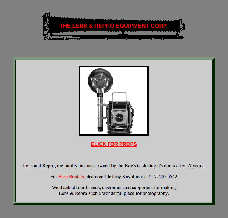 Lens & Repro, the family business owned by the Kay’s is closing it’s doors after 47 years. For Prop Rentals please call Jeffrey Kay direct at (917) 400-5542, email: jeffreykay53@gmail.com. We thank all our friends, customers and supporters for making Lens & Repro such a wonderful place for photography.